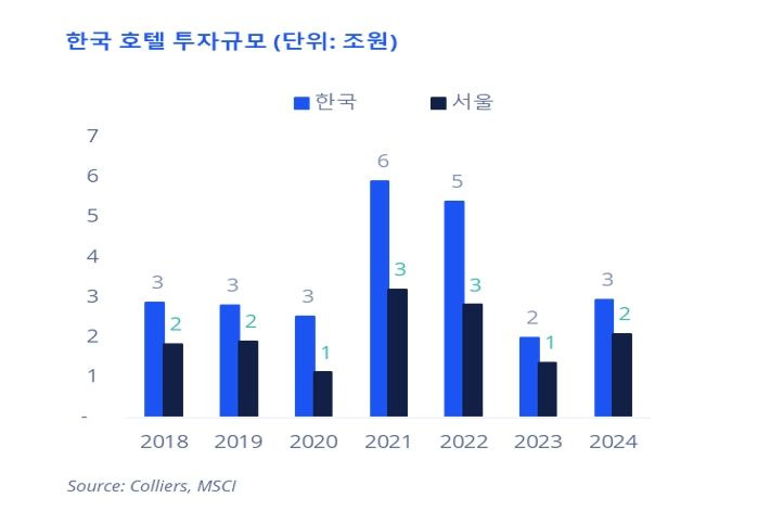 2024년 호텔 투자 규모는 2조 9000억 원으로, 2023년 1조 9000억 원 대비 크게 증가했다. 특히 서울 지역 호텔 투자 규모는 2조 원으로, 전년 1조 3000억 원 대비 가파른 성장세를 기록했다.