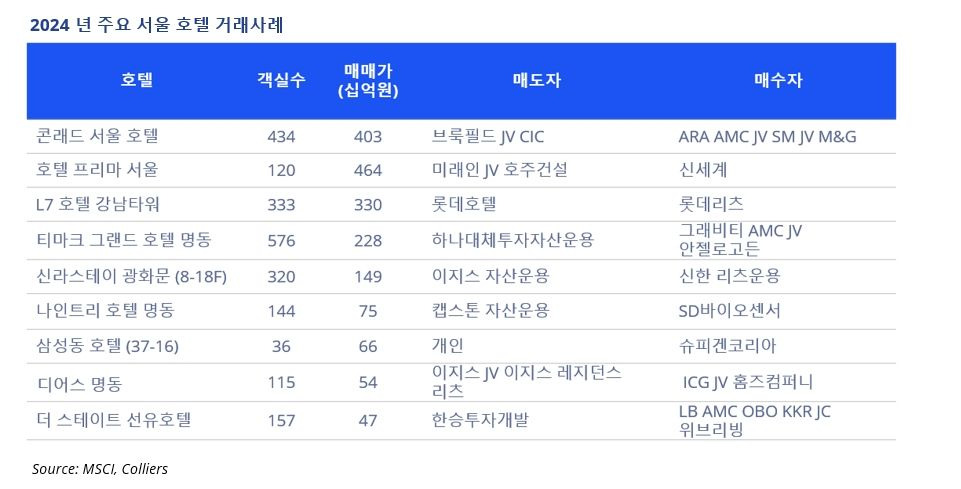 호텔업계의 회복세에 따라 호텔 자산을 운영 목적으로 한 거래가 증가하고 있다. 2024년 거래된 호텔 중 가장 큰 규모의 딜은 브룩필드 자산운용이 ARA 코리아 자산운용에 매각한 콘래드 서울 호텔로, 여의도 국제금융센터(IFC)의 일부였던 이 호텔은 약 4000억 원에 거래되었다. 또한, 그래비티자산운용과 안젤로고든은 티마크 그랜드 호텔 명동을 하나대체투자자산운용으로부터 2282억 원에 인수한 후 리모델링을 거쳐 IHG 호텔 브랜드인 보코(VOCO) 서울 명동으로 새롭게 개장해 운영 중이다.
