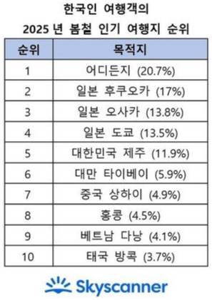스카이스캐너 봄철 인기 여행지 순위 발표